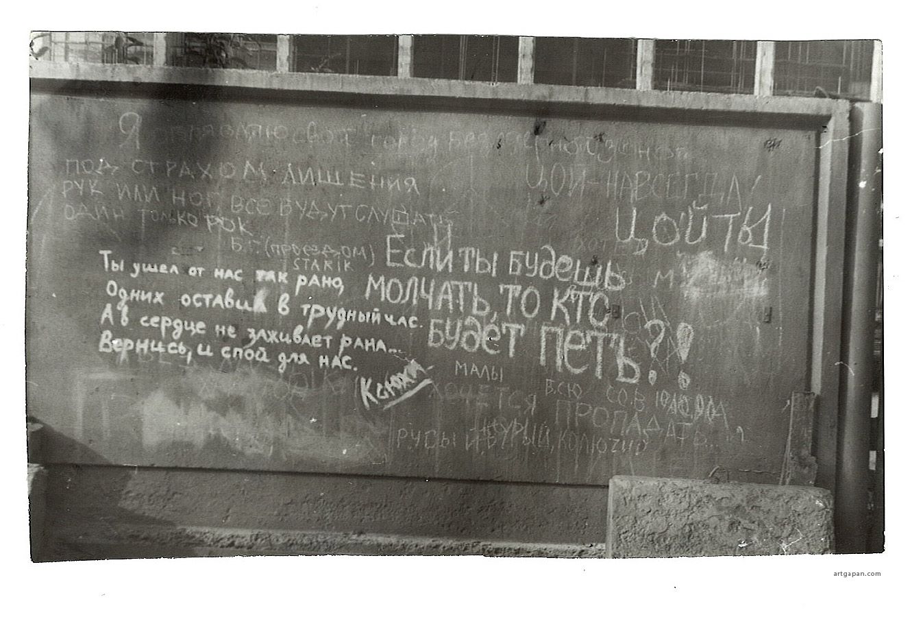 Это стена Цоя (тут у выхода из универсама Центральный такие вот были красивые граффити) Там за стеной строят мавзолей, так называемый дворец республики...