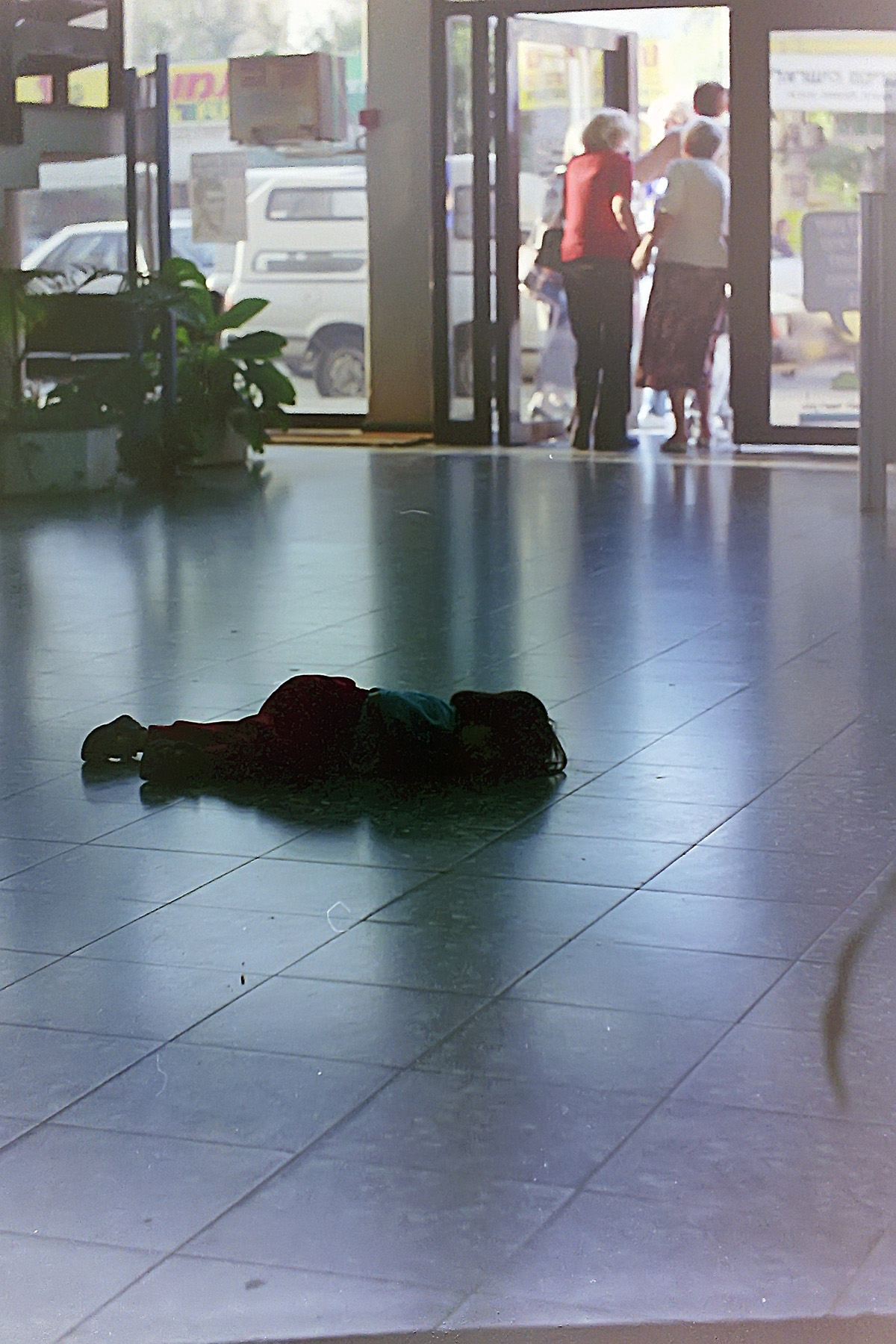 Банк в центре Тель-Авива. Маленькая девочка устала бегать и заснула, пока родители стоят в очереди....