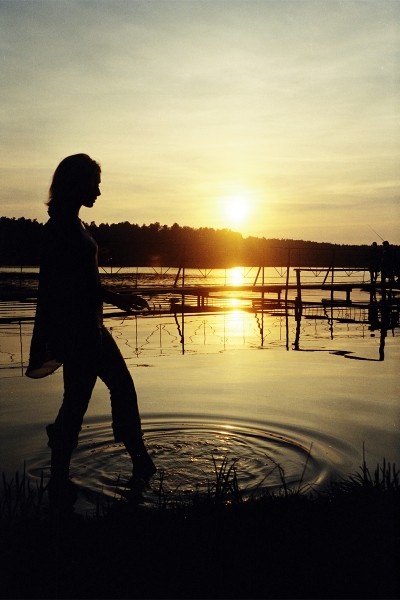 2001 год. Цветная пленка. Фото девушки, к которой был тогда (да и сейчас...да и навсегда...) неравнодушен. Последний день в детском лагере, где вместе работали. Дети уже уехали... Устроил прощальную закатную фотосессию. В воде попросил сымитировать шаг, чтобы небольшие волны пошли... (много написал... нахлынуло...)