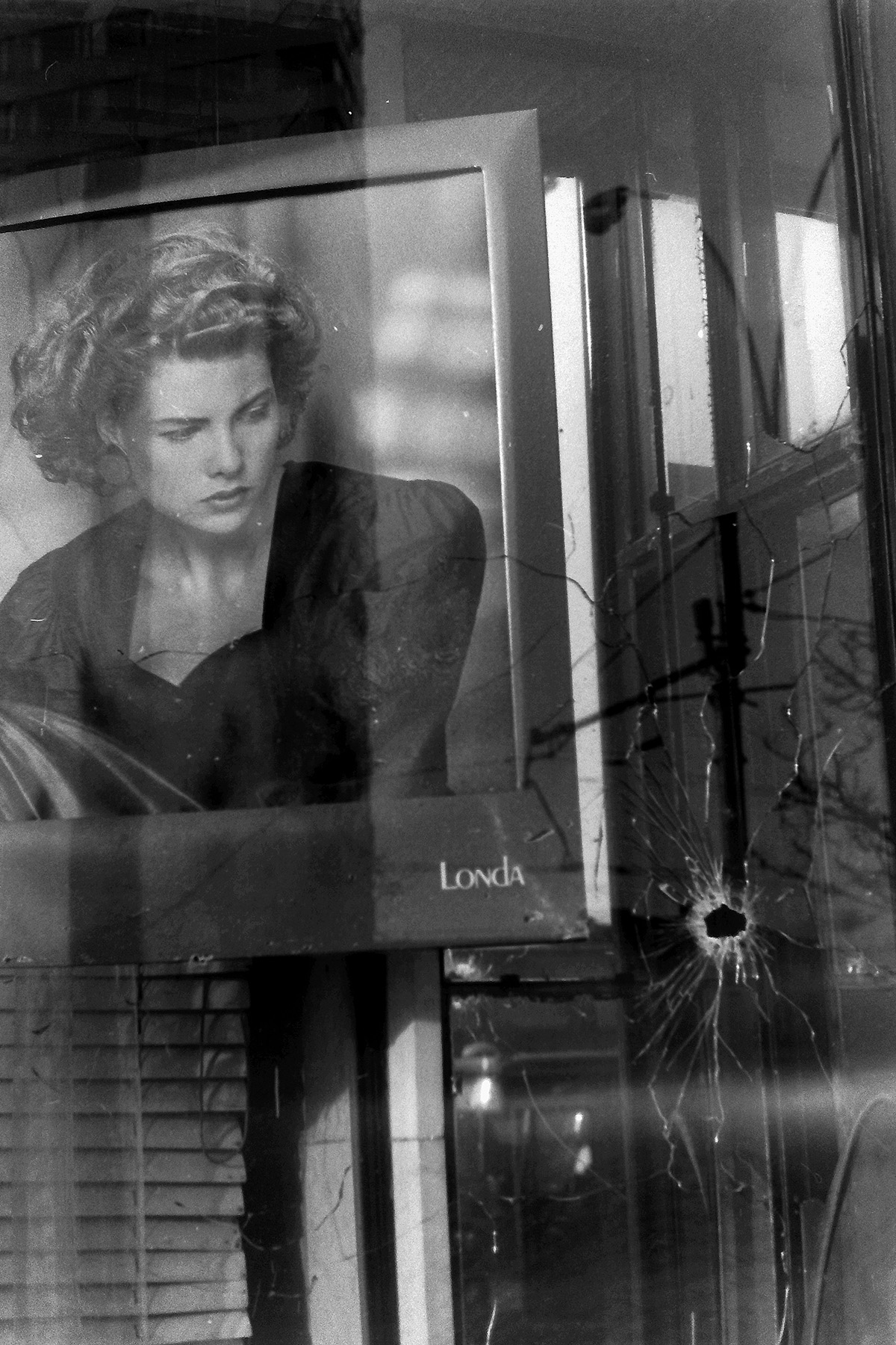 По-моему, самый интересный кадр. Девушка-модель с плаката смотрит на разбитое от выстрела стекло...