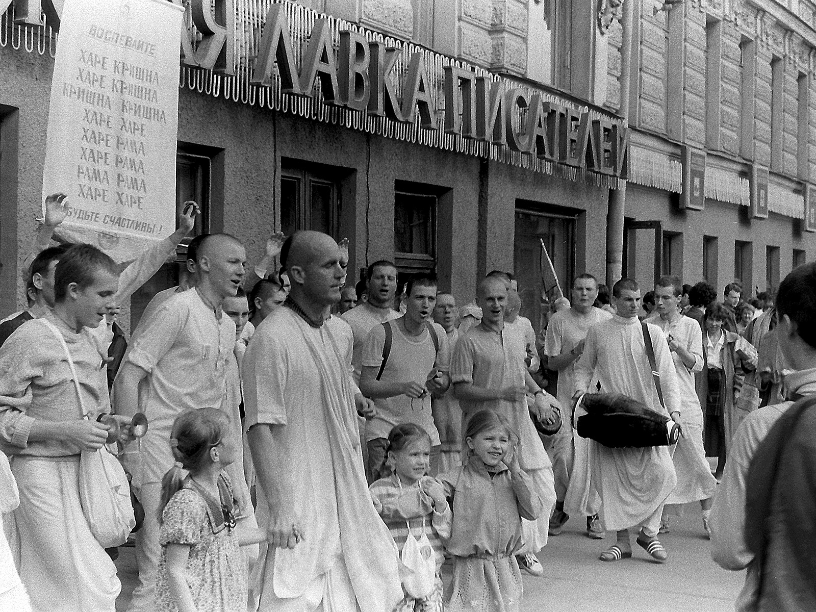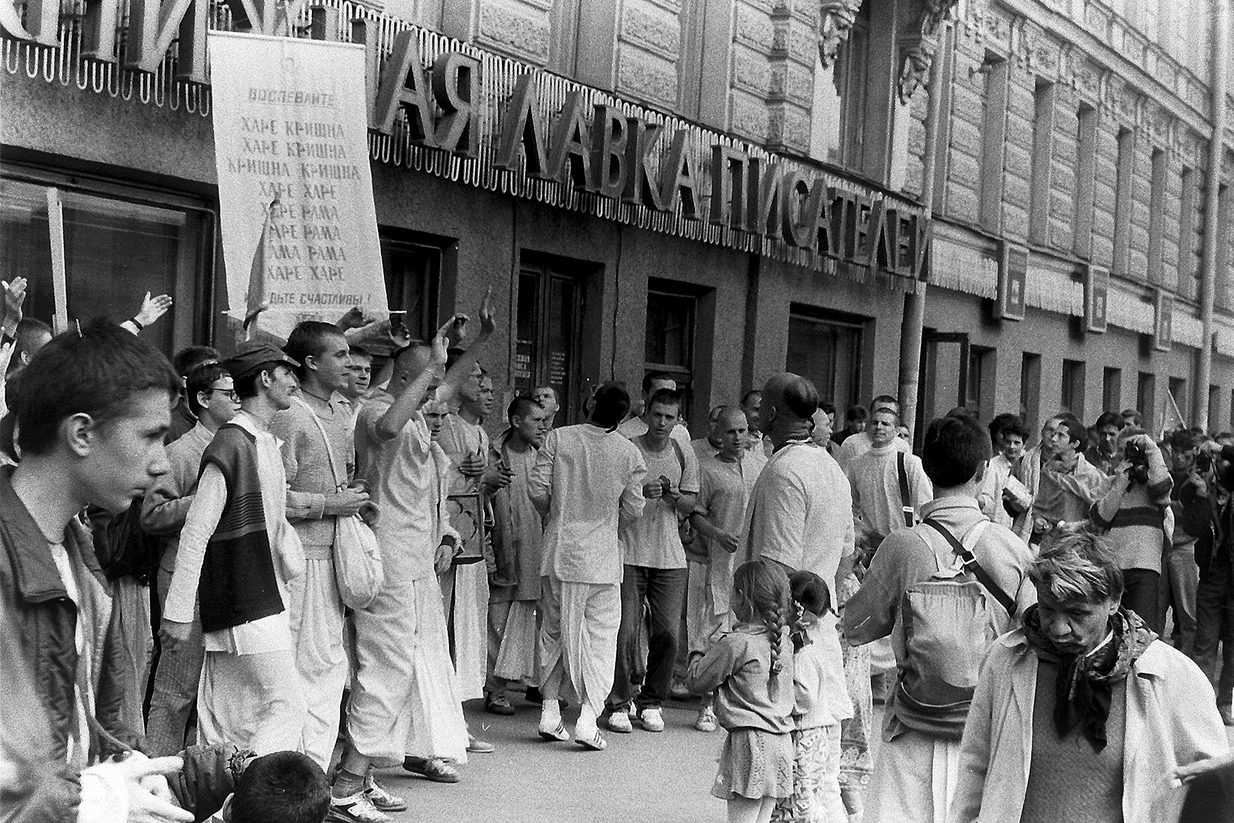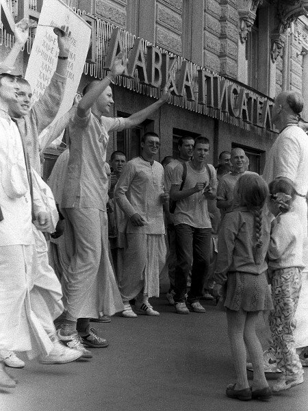 1987 год. Ленинград. Невский проспект, 66. Кришнаиты возле "Книжной лавки писателей".