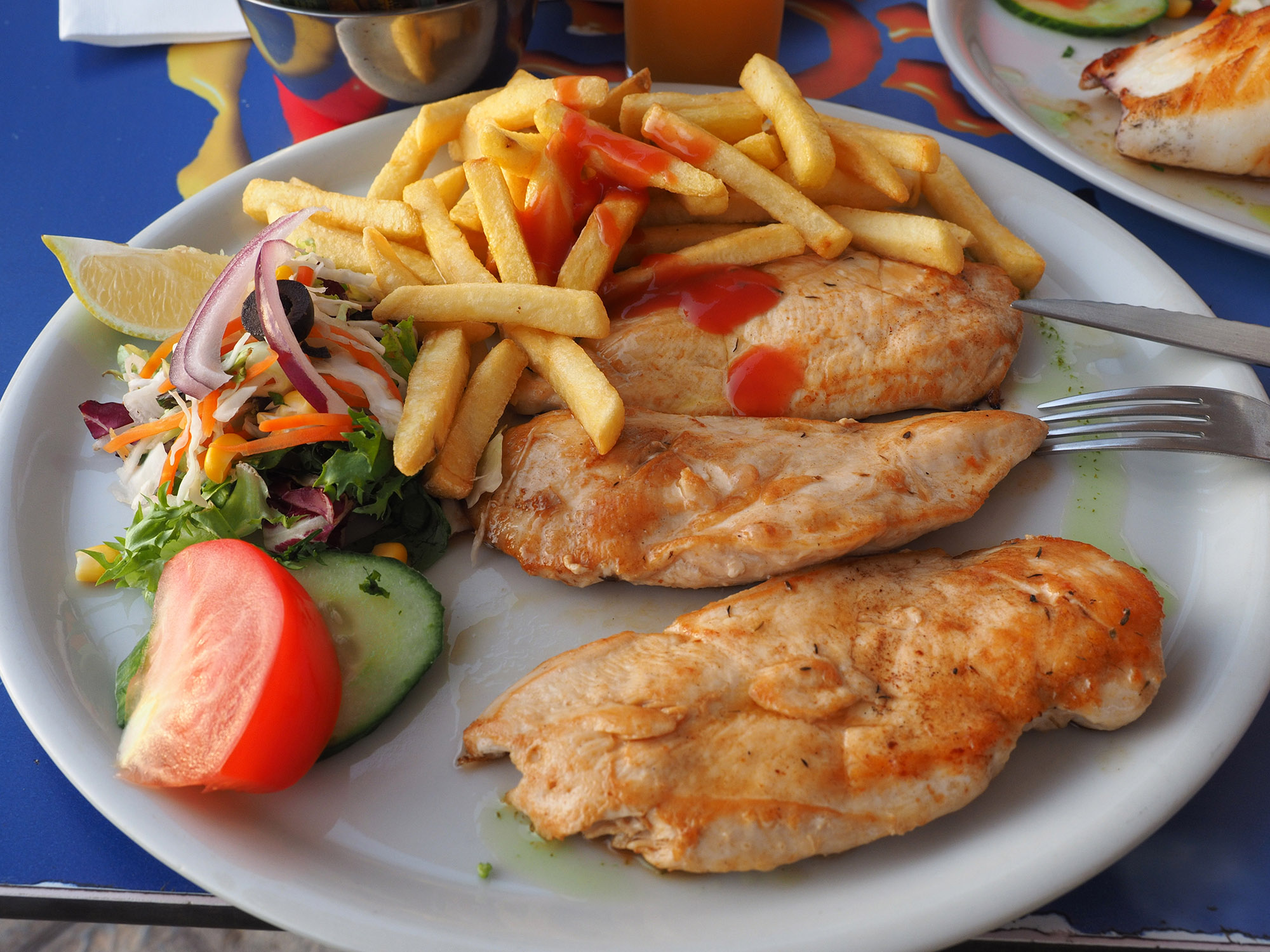 Пока ждали закат, зашли в ресторан прямо на берегу океана. Помня размеры тамошних блюд, я взял себе вот это из "детского меню". Стоило 5 евро: