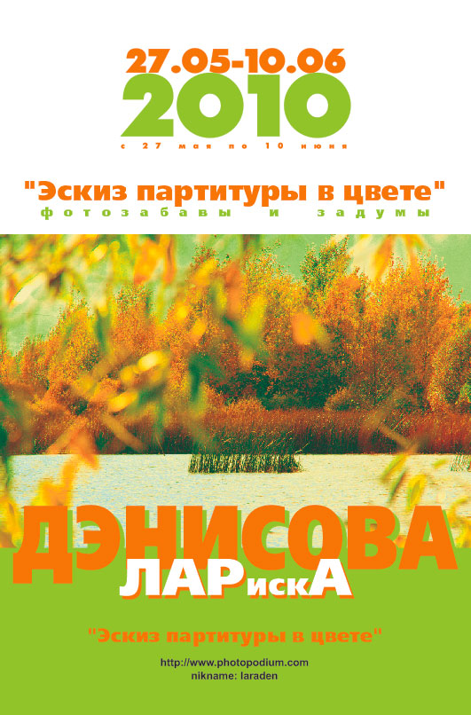 Яркую выставку « 3*7 » Людмилы Сиденко (nik LUSIA photoclub.by), сменила экспозиция фототэссы Ларисы Дэнисовой. Её фотографические ТАНКА сдержаны по форме, лаконичны и самодостаточны, как иероглифы японских стихотворных миниатюр. « Эскиз партитуры в цвете »- приятно видеть.