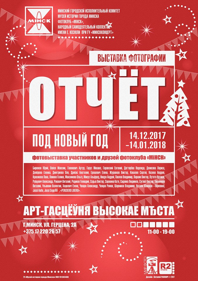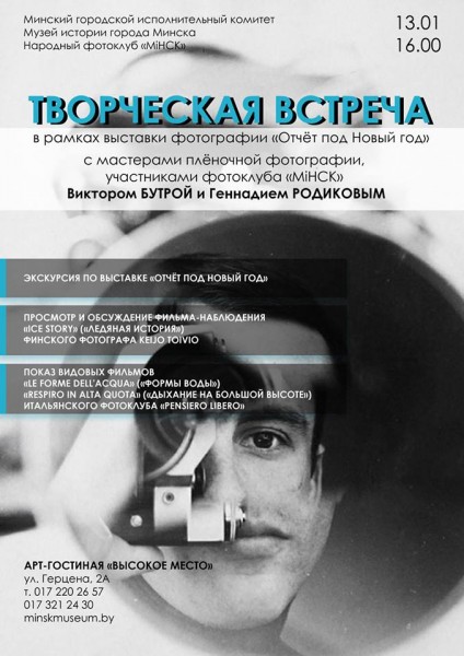 13 января 2018 года в 16.00 в Арт-гостиной «Высокае мѣста» состоится творческая встреча с мастерами плёночной фотографии, участниками фотоклуба «МiНСК» - Виктором Бутрой и Геннадием Родиковым, в рамках выставки фотографии «Отчёт под Новый год».
