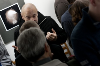 Валера очень тонко, волнительно рассказывал то, что рассказывал на открытии. И, в принципе, можно было бы свет и не включать - я вновь, как побывал в Сограде.
