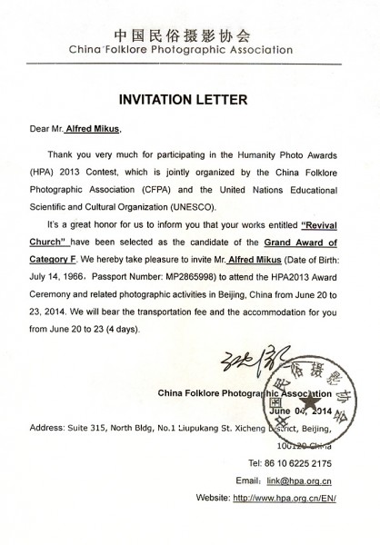 We are proud to announce that the long-expected award ceremony of the Humanity Photo Award (HPA) 2013 will be held in Beijing on June 21, 2014. Your support and well-wishes have been vital to its success. Now you are most cordially invited, as a winner and an honored guest, to attend the award ceremony, where we will announce winners of HPA2013 Grand Awards and the Jury’s Special Awards. An exhibition of the winning photos, entitled Memories of the Mankind VIII, will also be launched at the ceremony. We will pay for your transportation and accommodation during the event.