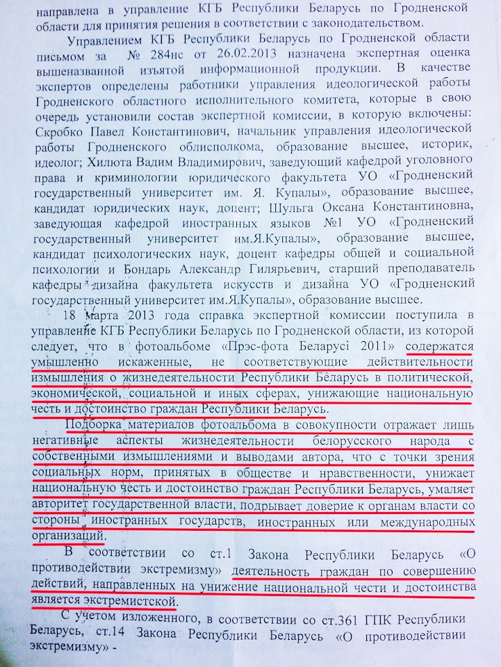 Вот полная экспертиза альбома "Пресс-фото Беларуси", сделанная идеологами и преподавателями на заказ КГБ. Материалы дела отснять не разрешили, поэтому текст просто преписан. Примечательно, что экстремизм нашли даже в рубриках "Спорт" и "Природа".