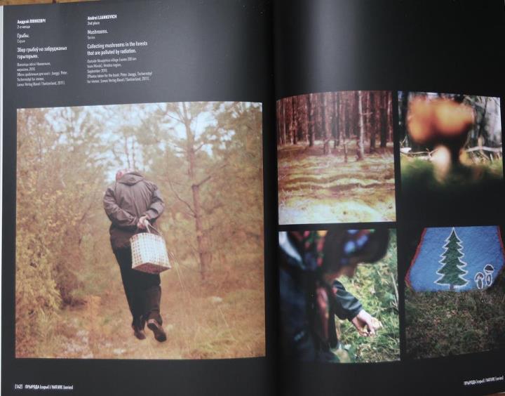 Фотоматериалы рубрики «Прірода» (страницы 142-145) содержащей фотографии сбора, заготовки и консервации грибов на фоне знака радиационной опасности иллюстрирует в стиле аллегории уничижительное состояние белорусской нации, ее природы.