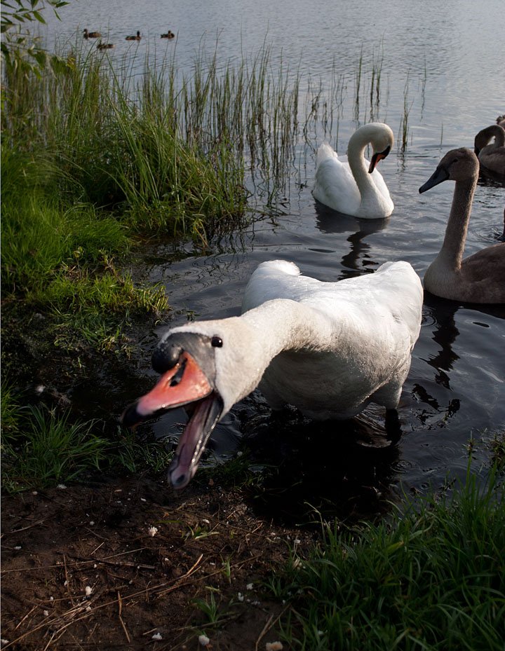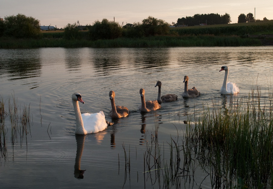 Первый снимок многоворящий... или шипящий, ведь на снимке - лебеди-шипуны. На втором солнечный свет делает хорошую подсветку, объемные лебеди с лебедятами получились.