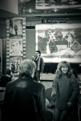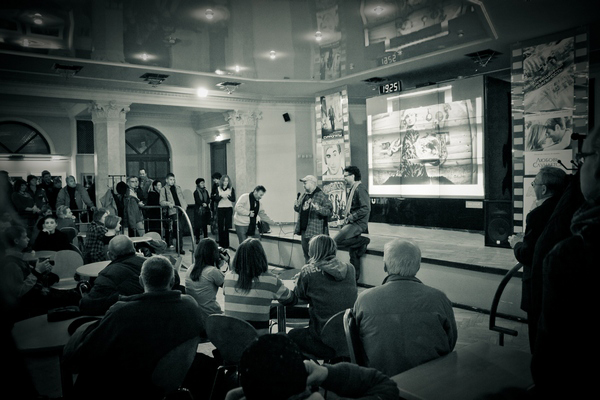 Идею использовать большой формат в кинотеатре Центральный высказывал еще Валерий Лобко. Мы с выпускниками попробовали и, похоже, сработало. Если раньше зрители пробегали мимо работ, как будто их и нет на стене, то сейчас происходит так как написал Сергей. Работы смотрят почти все.