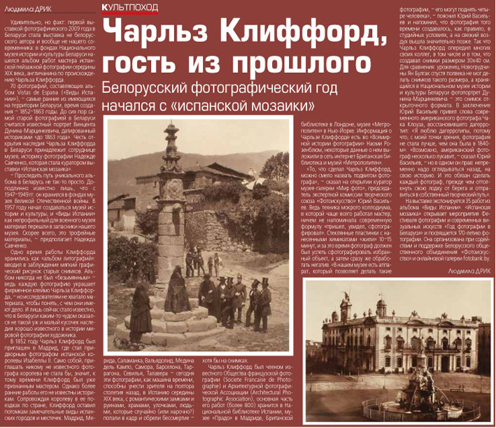 Удивительно, но факт: первой выставкой фотографического 2009 года в Беларуси стала выставка не нашего современника и к тому же не белорусского автора и вообще: в фондах Национального музея истории и культуры Беларуси нашелся альбом работ мастера испанской пейзажной фотографии середины XIX века, англичанина по происхождению Чарльза Клиффорда.