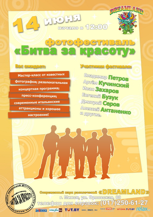 ВНИМАНИЕ! 14 июня в 12 часов парке "Дримлэнд" пройдёт фотофестиваль "Битва за красоту!". Шесть известных в Беларуси фотографов будут в течении 3-х часов проводить портретную съёмку с опытными моделями. Фотографы будут разделены на две группы, в каждой из которых будут 3 человека и три модели. Каждый час съёмки фотографы в группе будут снимать одну модель, с тем, чтобы по прошествии трёх часов, они могли поработать со всеми тремя моделями в своей группе. После каждого часа съёмки, будут распечатываться фотографии, так, чтобы зрители могли увидеть работу фотографа в виде фотографий в режиме «реального времени». Во время съёмки фотографы будут проводить импровизированные мастер-классы, с тем, чтобы люди, увлекающиеся фотографией могли увидеть то, как работают профессиональные фотографы. Фотографы будут комментировать свои кадры и свои технические приёмы съёмок, а желающие могут задавать вопросы по конкретной съёмке и снимать параллельно с самим фотографом.