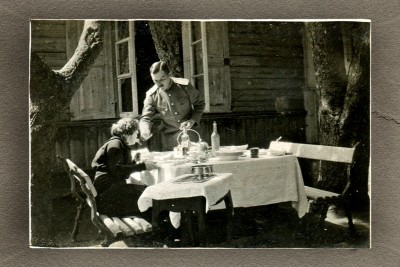 Он был на первой мировой войне, служил в чине подполковника военным инженером, его батальон стоял на нынешней территории Польши. Совсем недавно я обнаружила его фронтовой альбом со снимками его сослуживцев и кадрами фронтового быта. Когда в Екатеринбурге умерла его дочь Ксюша (она никогда не имела собственной семьи), соседи покойной переслали ее фотографии вместе с отцовским армейским фотоальбомом на адрес моей тётушки в Гродно. Почтовая бандероль много лет лежала не распакованной в тётушкином чемодане с другими ее документами и фотографиями. Там я фронтовой альбом дедушки Жоржа и обнаружила.