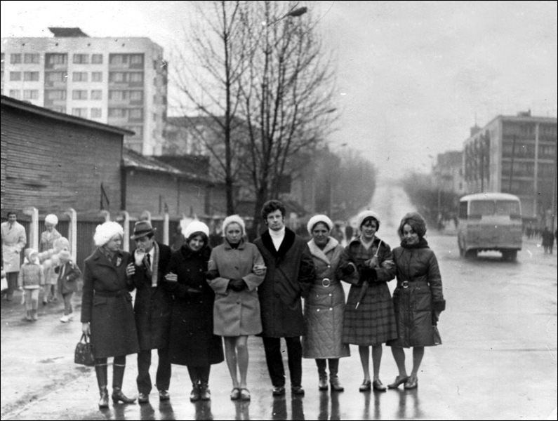 Фото 3: 7 ноября 1971 года мы, работники АТС (на снимке я крайняя справа), возвращаемся после демонстрации по Проспекту Космонавтов. Слева на снимке виден забор Скидельского рынка.