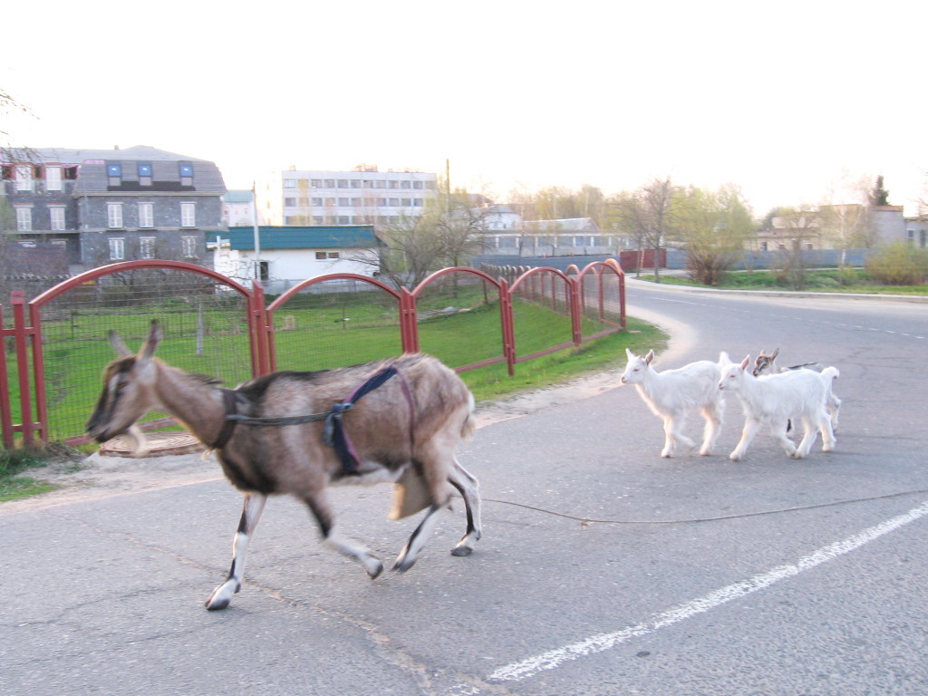 Немного юмора. Необычные пешеходы мне вчера встретились в Несвиже. Мамаша коза важно ведёт домой своих "тройняшек"
