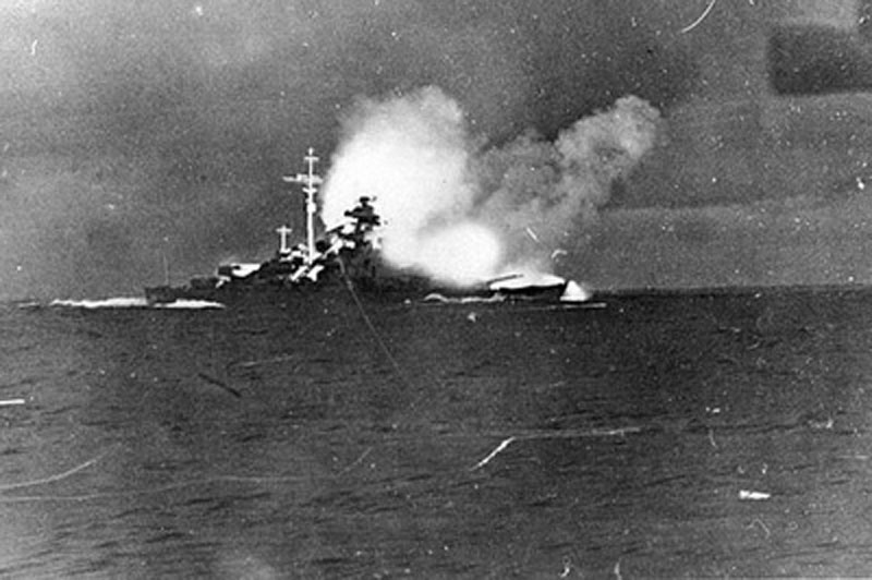 германский линкор "Бисмарк" взрывается после попадания английских торпед