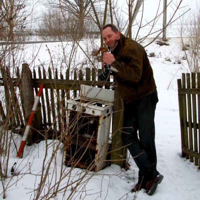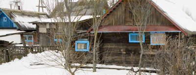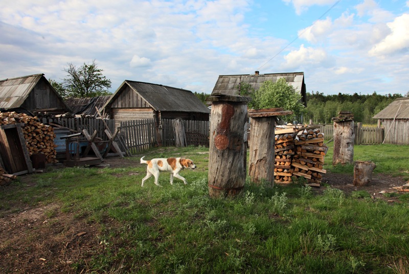 Хочу добавить несколько снимков этой же деревни Рудня (Тонежская), она самая отдаленная от цивилизации, но сюда два раза в неделю ходит автобус и продуктовая лавка, есть телефонная линия и электричество. Мы 16 км добирались на своем "вездеходе" до этой деревни по горкам песчанной дороги через густой лес и болота, и нам повезло, что была сухая погода. Живут здесь несколько семей полешуков, занимаются пчелами и огородами, держат скотину, собирают грибы и клюкву. Местные собаки здесь относятся к незнакомцам доброжелательно, машут хвостом и лезут лизаться. Многие хаты пустуют.