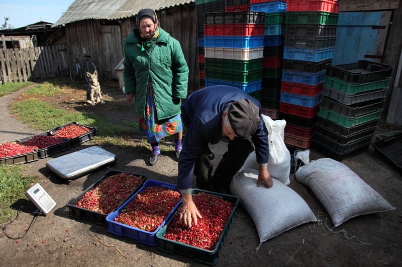 На фото 15 запечатлены местные старики, которые привезли во двор заготовителя собранную ими на болотах клюкву. Скоро прибудет фура, клюкву в ящиках перегрузят в кузов, и она отправится в большой город на переработку.