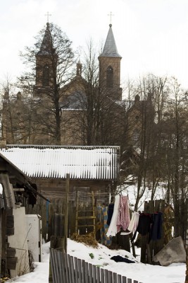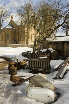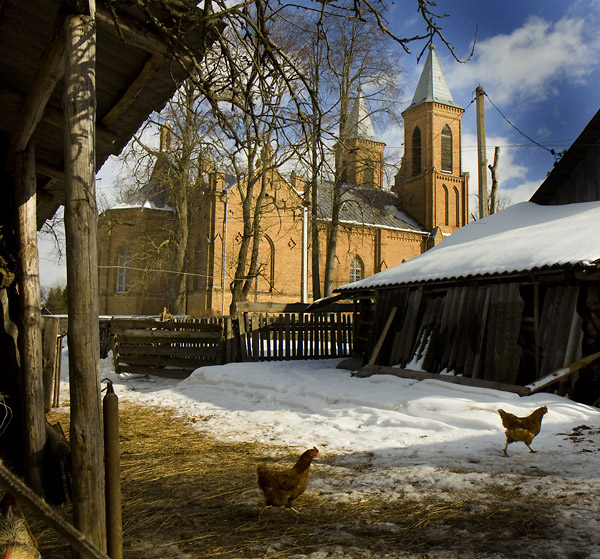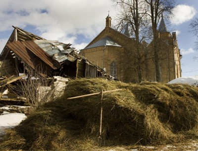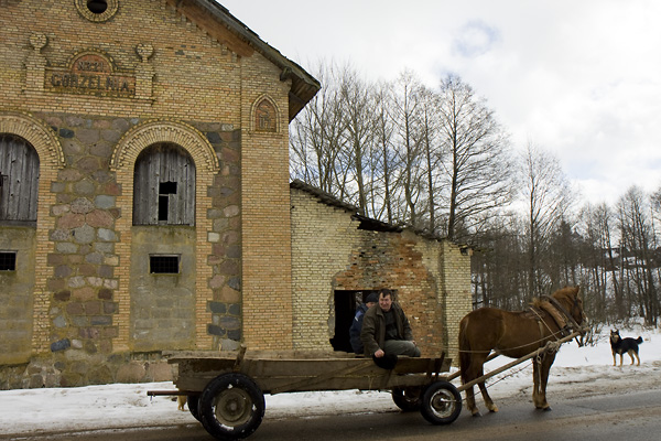 На въезде в деревню сохранился бровар(всё что осталось от усадьбы Скиндеров),процесс фотографирования которого очень заинтересовал местных жителей: