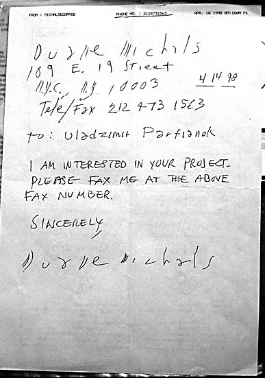 была даже идея пригласить Михалса в Минск для участия в фотопроекте, который планировалось замутить НОВой и Шестой линией (в бытность Оли Копенкиной), и который — увы — так и не состоялся. Однако легенда при этом проявила интерес.... см. сохранившийся факс ниже...