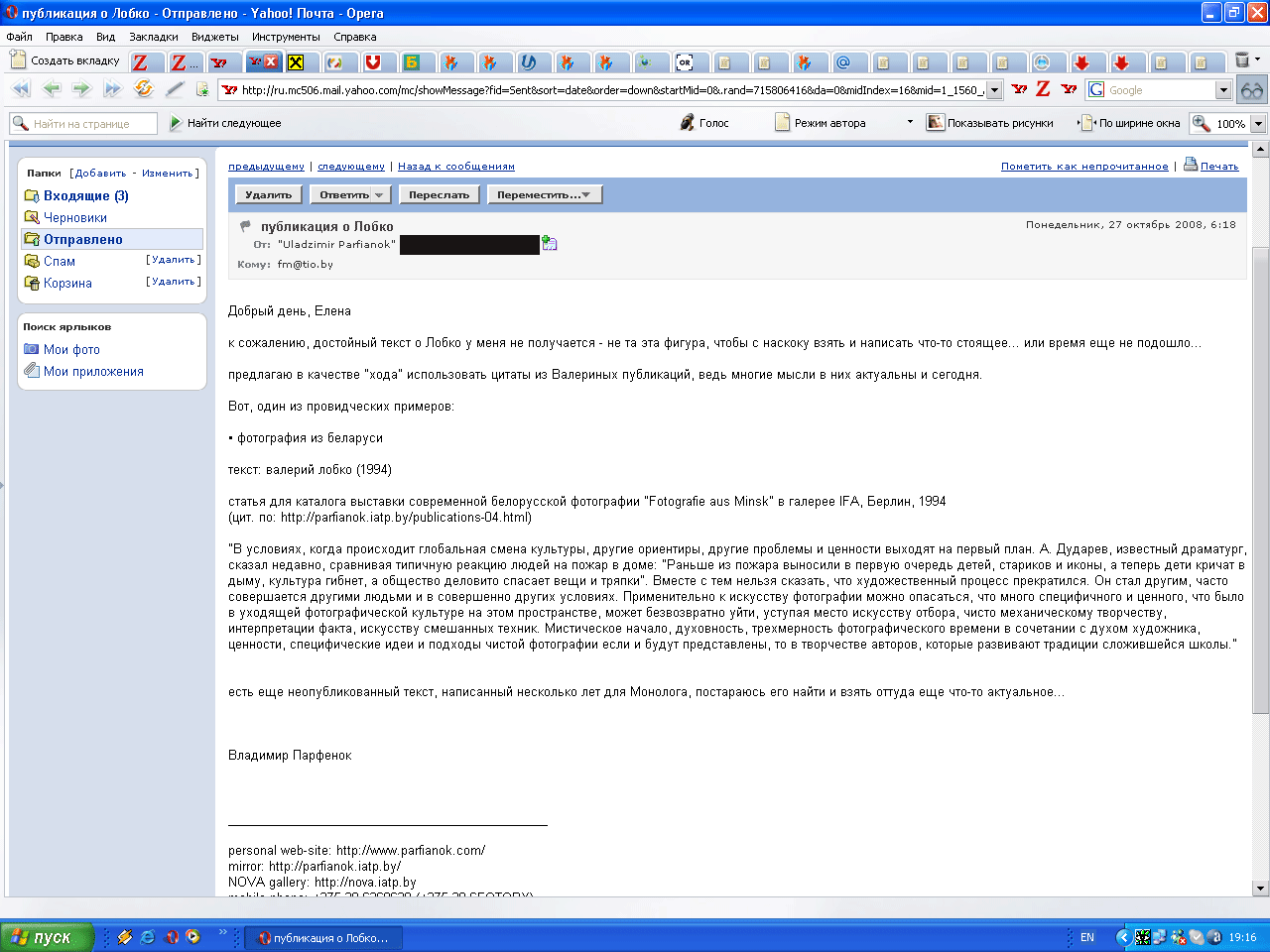По поводу материала. Я, как и абсолютное большинство других фотографов, фотолюбителей, фотохудожников Беларуси, не являюсь учеником Валеря Лобко. Его деятельность и творчество никак не отразилось на нас, но я посчитал своим долгом изменить четвертый номер журнала, потому что случилась непоправимая трагедия, и каждый уважающий себя и белорусскую фотографию человек должен был реагировать адекватно, в соответствии со своими возможностями. Мы решили дать снимки и материалы о Валерии, мы обратились лично к вам, как бывшему заведующему отделом в журнале "Фотомастацтва" и ученику В.Лобко, помочь подготовить материал. И что в итоге?