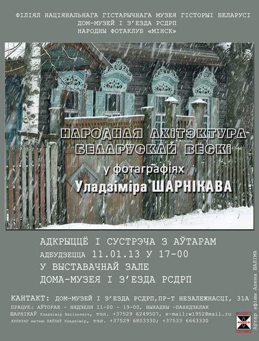 11 января 2012 года c 17часов в выставочном зале «Дом-музея І съезда РСДРП», являющегося филиалом Национального исторического музея Республики Беларусь, открывается выставка «Народная архитектура белорусской деревни в фотографиях Владимира Шарникова».