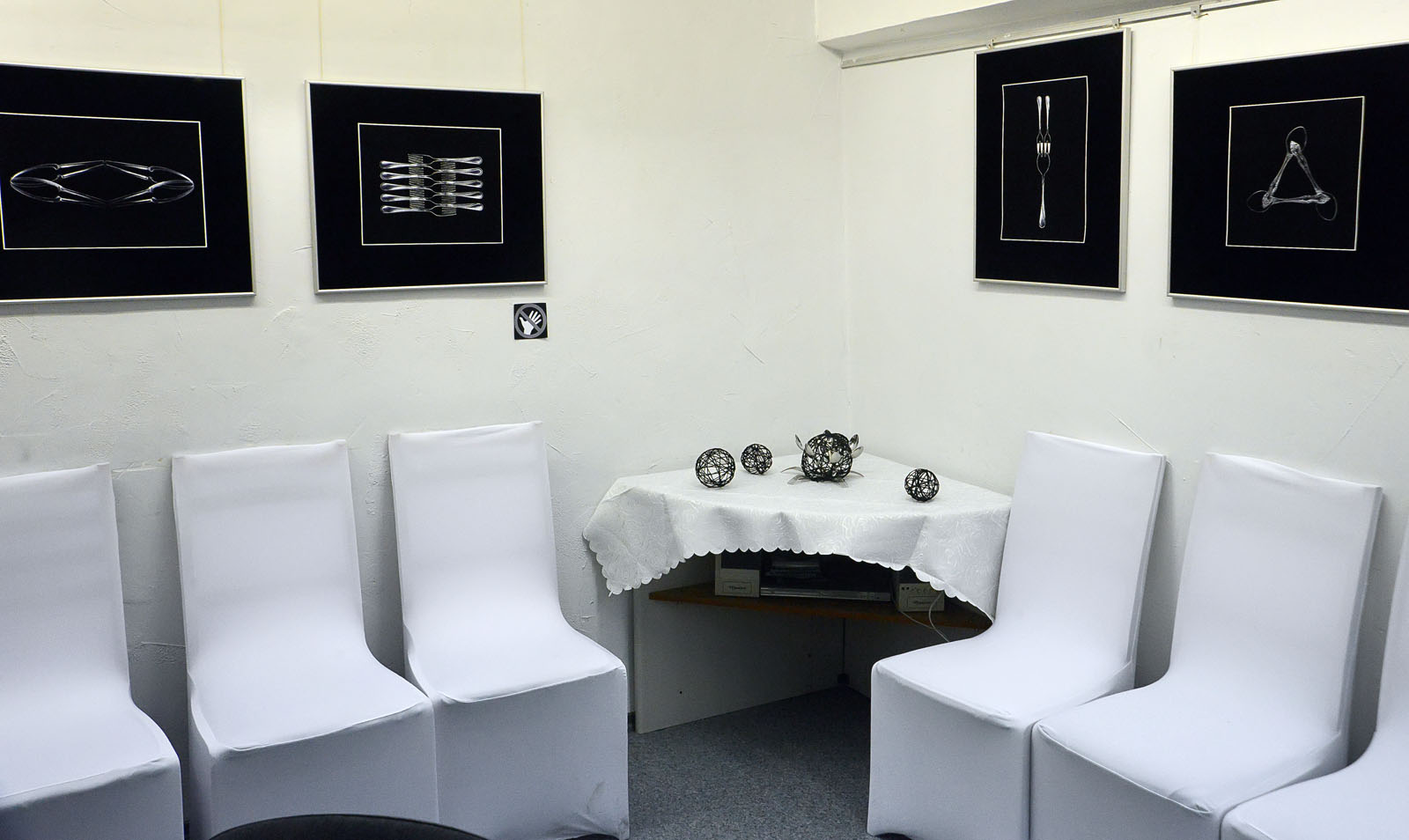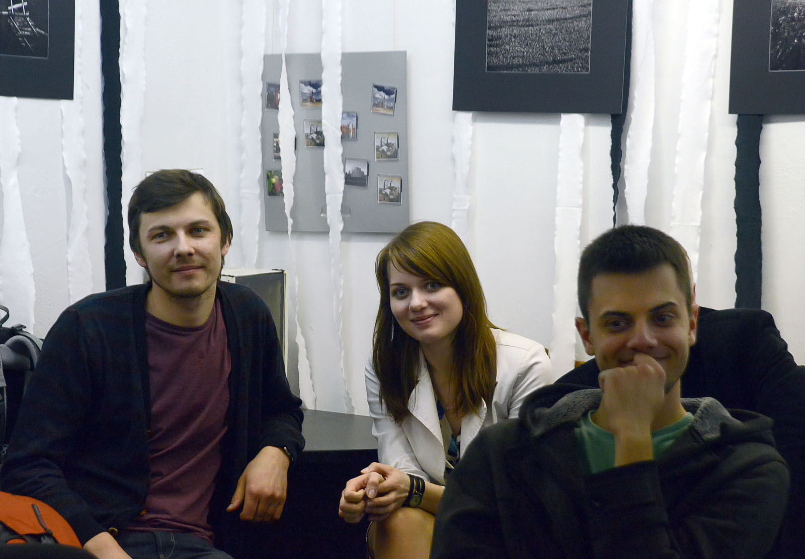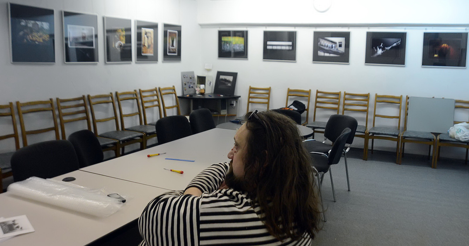 К слову, Илья как и Андрей Акушевич, стремился преобразовать выставочное пространство галереи клуба на время открытия. На мой взгляд, его подход в этом вопросе,- освободить стены от стульев и обеспечить «галерейный» режим обзора, имеет определённый смысл и более удачен,- чем «ленточное» преобразование от Андрея.