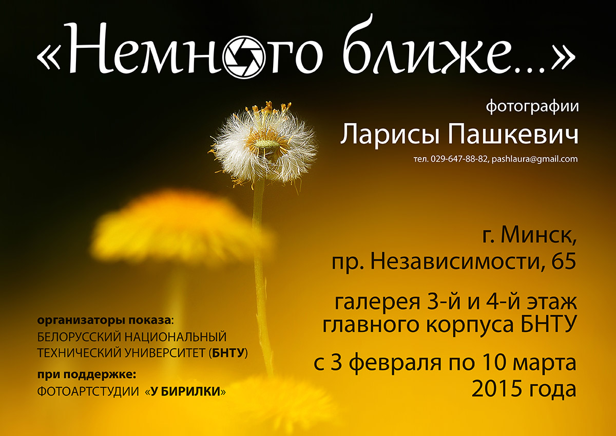 Галерея начинает 2015 год с знакомства зрителей с творчеством молодого белорусского фотографа Ларисы Пашкевич. Представленные работы автора, которые условно можно отнести к макрофотографии, до удивительного трогательно и бережно погружают нас в мир сказки и авторских фантазий.