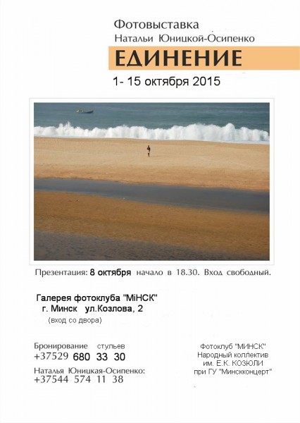 Единение – союз, соединение, связь, гармония… Как часто мы позволяем себе остановиться, оторваться от бесконечной суеты и окунуться в лоно природы наедине с собой? Что мешает нам раствориться среди птиц, деревьев, облаков и ощутить гармонию этого единства? И понять, наконец, что не существует человека – царя природы, а есть человек – часть великого целого. Что дает нам океан? Чем мы отличаемся от птиц? Какую силу и исцеление дает нам природа? Кто мы в этом мире? Состояние умиротворенности, отрешенности, гармонии, некой невесомости… присутствует в работах автора. Все фотографии сняты в одном месте индийского штата Керала. Автор – Наталья Юницкая-Осипенко. Для нее фотография – не ремесло, не хобби, не увлечение. Это ее жизненная философия, отражение состояния ее души, которым она делится со зрителем. И если происходит связь между автором и зрителем, образуется понимание в мировосприятии, мироощущении, в построении композиции, то это и есть своего рода Единение или гармония…