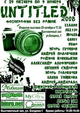29 октября в 17:00 в выставочном зале по ул. Болдина состоится открытие второй по счету фотовыставки «Untitled-2008». В список участников вошло 20 самых-самых: ZZAARR, Игорь Головачев, Андрей Половченя, Родион Ковенькин, Игорь Сечинов, Евгений Сидоров и др. Авторов объединяет молодость, жажда эксперимента, нестандартный подход к фотографии, наш город и Могилевская Интернет-Галерея и Центр Живого Рока. В общей сложности, на выставке будет представлено порядка 100 работ не связанных общей тематикой.