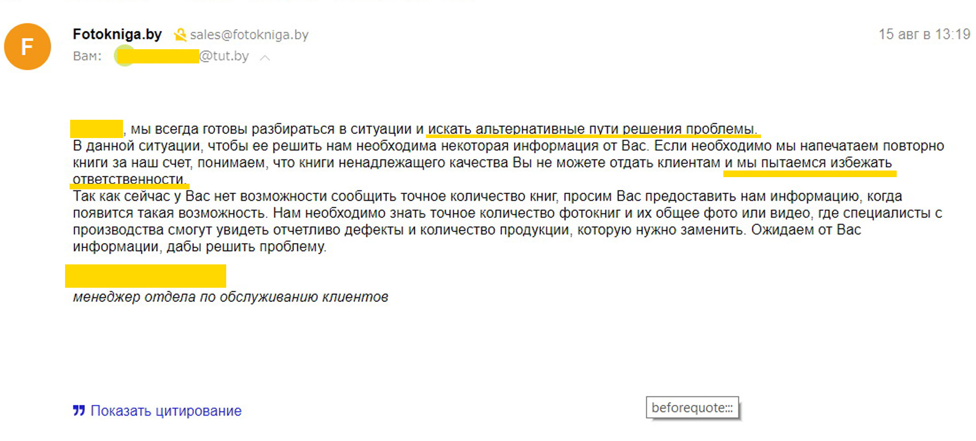В одном из писем сотрудник допустил ошибку, но не смотря на это, в этом же письме мы заверили Вас, что перепечатаем продукцию ненадлежащего качества, нам требовалась лишь информация касательно количества книг, чтобы согласовать это. Затягивать решение вопроса не в наших интересах, но оперативное решение требует заинтересованности двух сторон. Позже мы получили от Вас информацию и смогли все-таки вынести решение по проблеме, которая возникла.
