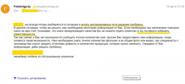 Сегодня пришло шестнадцатое (!) сообщение от их менеджера отдела по обслуживанию клиентов. По крайней мере он так подписался. Шестнадцатое сообщение на почту плюс разговоры по телефону и в очередной раз fotokniga.by (фотокнига бай - они же Профото бай) пытаются уйти от ответственности, изворачиваются, словно гадина, прижатая весом улик (весом сорока трёх бракованных книг!).