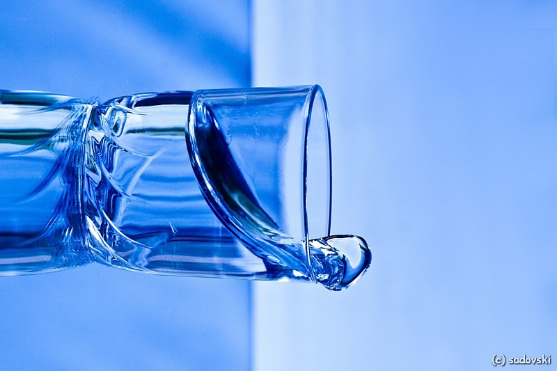 Освещение - встроенная вспышка, в абсолютно тёмной комнате. Камера на штатив, ББ для ламп накаливания (придание синевы воде), предварительная фокусировка на предполагаемом месте падения капель, спуск затвора с задержкой через 10 сек., пока идёт отсчёт времени, быстренько выключается свет, далее, в полной темноте, аппарат строчит серию из 10 кадров, в этот самый момент подручными средствами капаем капли, клизма, пепетка сгодиться - готово:))