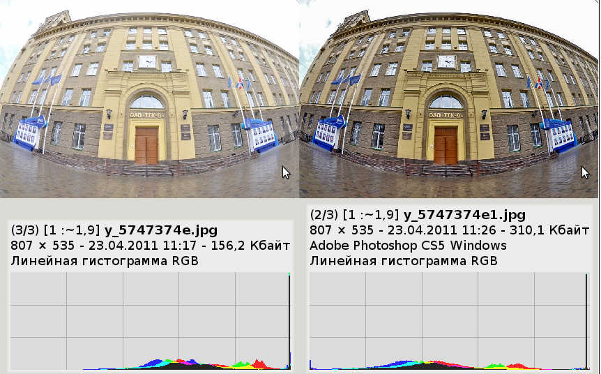 Видно, что на левом снимки низкие уровни яркостей почти полностью отсутствуют, и есть очень большой пик максимальной яркости, который можно считать засветкой. Очень странно, что экспонометр камеры допустил такое.