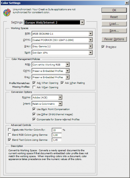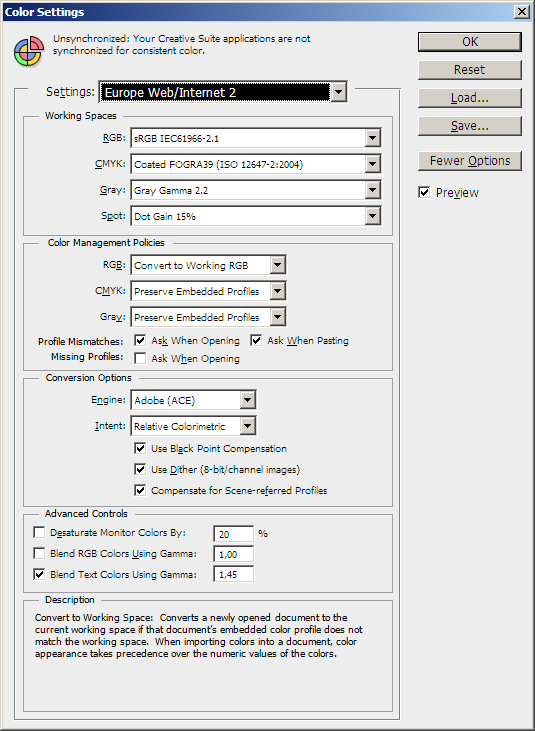 Edit, Color Settings, Settings: Europe Web/Internet (Правка, Настройки цвета, Настройки: Web/Internet для Европы).