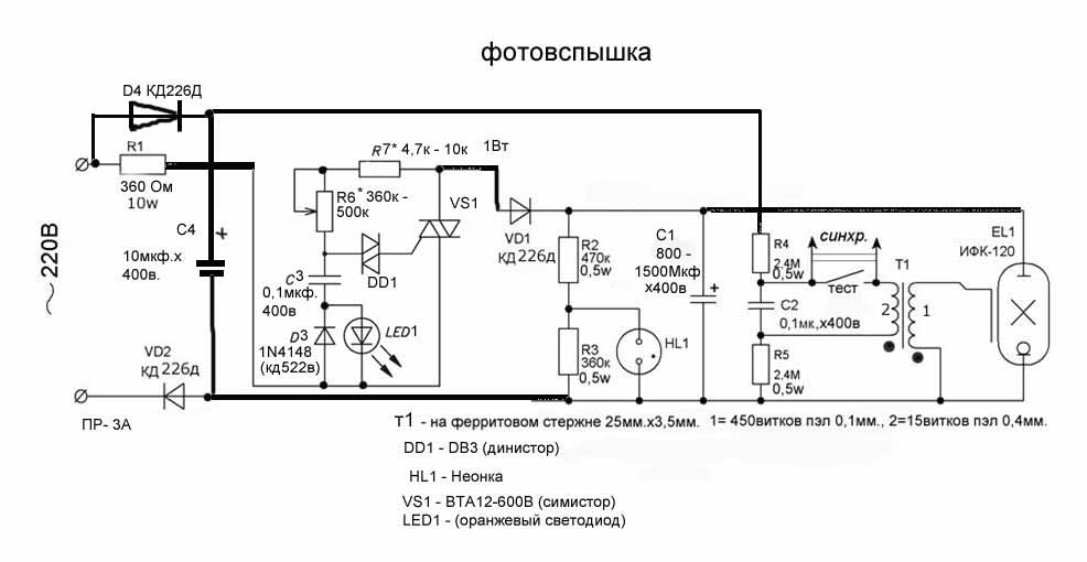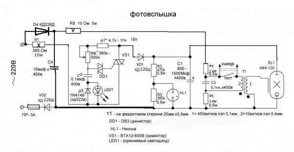 Выношу схему регулировки простой фотовспышки на всеобщее обозрение, сам еще не собрал но думаю попробовать, незнаю что из этого получится.