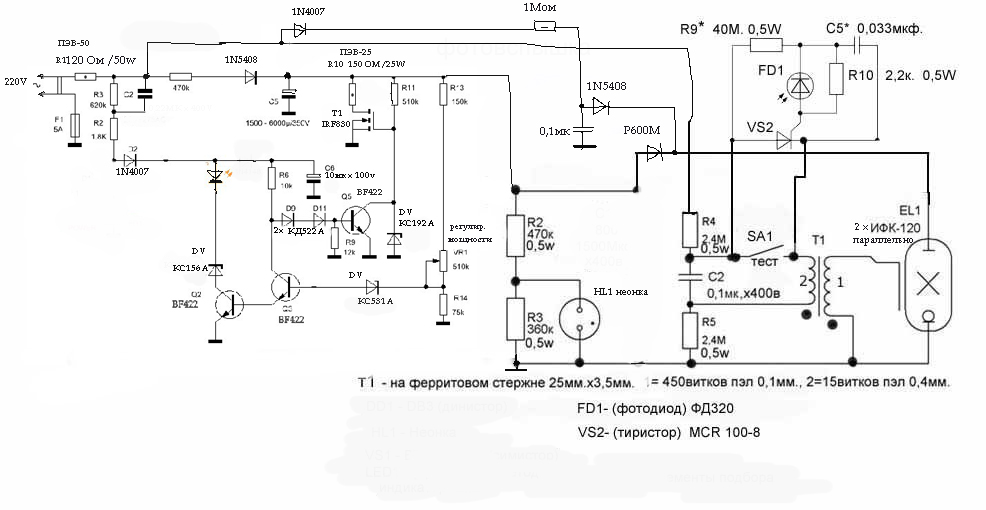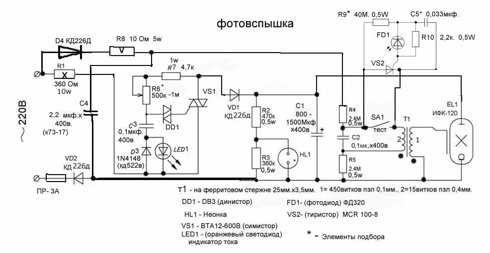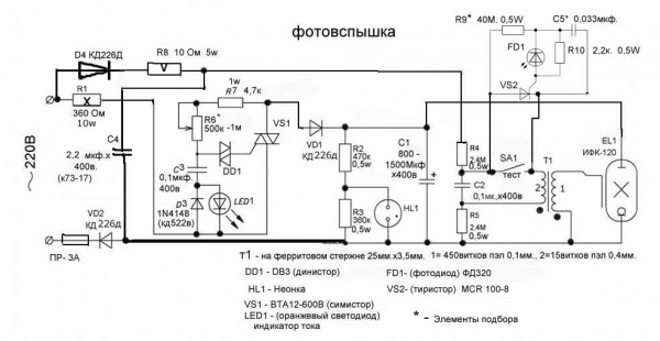 Окончательная схема фотовспышки с регулировкой мощности и ИК-синхронизатором . Собрал,проверил-все работает. Мощность зависит от заряда электролита 800 - 1500 мкф.х400в. соединенный с ИФК-120, напряжение на электролите регулируется в пределах 180 - 290 вольт ( может и в других пределах при подборе элементов схемы указанные - * ). Высоковольтное напряжение "поджига" лампы постоянное. Время заряда от 1 до 4 сек.