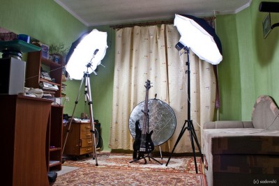 Использовалось три галогенки 2х500Вт + 300Вт. Два зонтика.