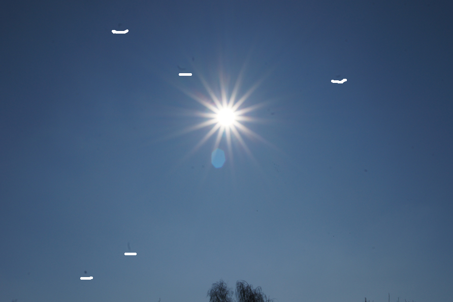Ну и последний вариант -- а может быть просто в небе что-то летало? Какая-нибудь мошка, птица где-нибудь далеко? Вот они и попали в кадр. Если этот так, то на втором снимке, снятом сразу за первым, пятна должны измениться.
