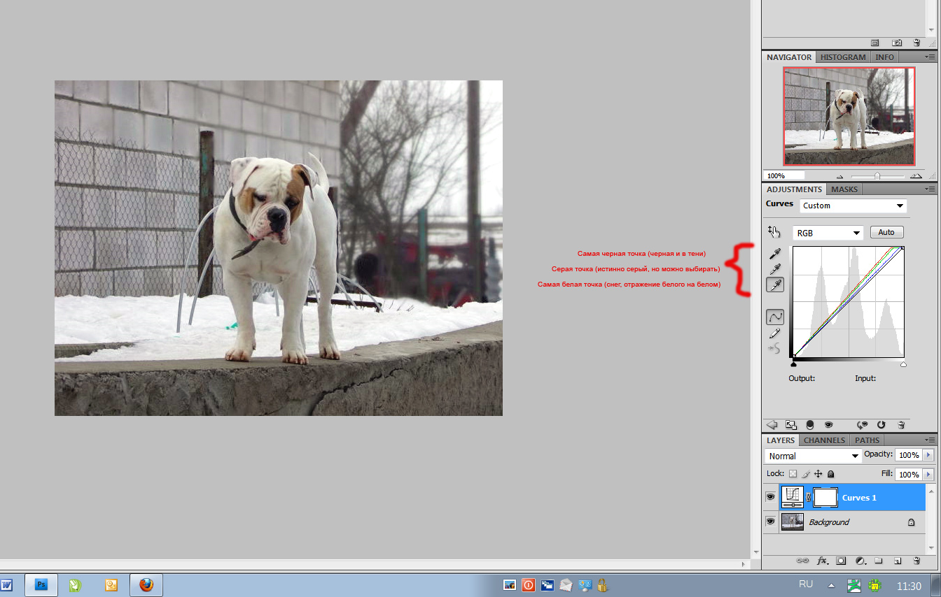 2. Выбираем точки. Белую пипетку - на белое, на снег. Черную - на черное, ноздря собачки. Серую - на предположительно самую серую часть стены. Можно только белую. Или только серую. Серую можно тыкать в разные места - будут разные оттенки, какой кажется правильным, тот и выбираете.