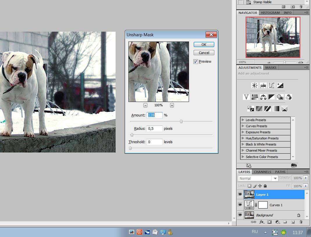4. Делаем более резким. Циферки - как у кого описаны, я использую радиус 0,5 иногда говорят про 1.