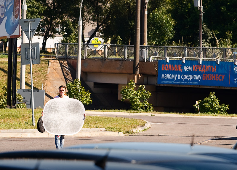 У меня тож отражатель 170см*100см, серебро-белый, чаще пользую серебро. Иногда ухитряюсь один и снимать и держать, главное правильно стать (учитываю солнце, ветер и задний план).