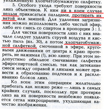 "Протирать оптические просветленные поверхности объектива, а также защитное стекло видоискателя следует легким касанием фланелевой салфетки или ватой, слегка смоченной спиртом."