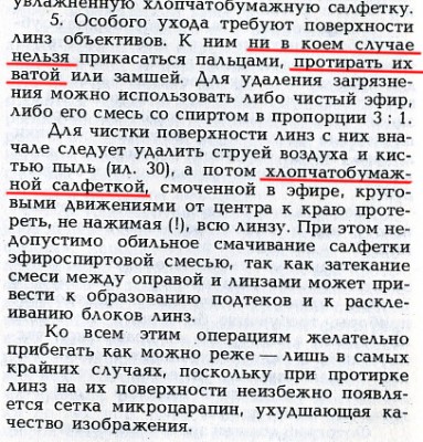 Вот например, Д.О. Стародуб в своей книге "Азбука фотографии" (1987 г.) советует протирать линзы ни в коем случае не ватой, а только хлопчатобумажной салфеткой: