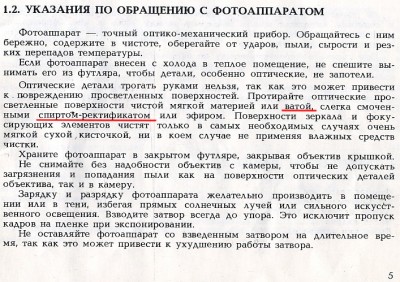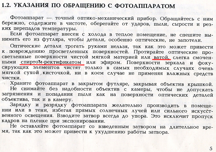 В то же время безымянный автор инструкции к фотоаппарату "Зенит 12ХР" (примерно 1984 г.) НАПРОТИВ :!: рекомендует чистить линзы именно ватой! Причем, можно и спиртом!: