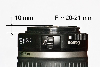 при беглом сравнении положения задней линзы с таковой у EF 50 1.8 установлено, что безопасное фокусное около 22 мм. позже проведу более точные замеры.