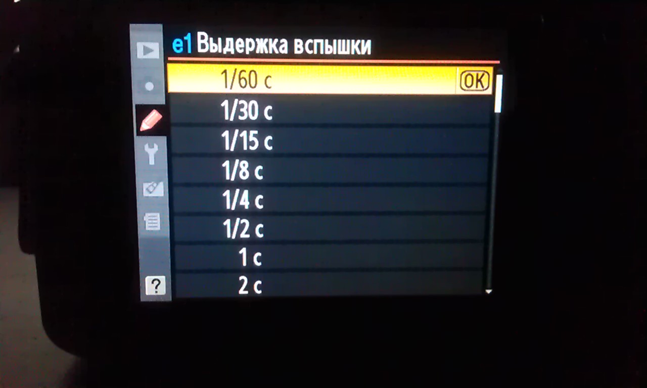 Алексей851, какие значения есть ещё в пункте меню "e1 Выдержка вспышки" кроме установленного 1/60?
