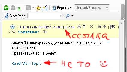 Ссылка на форумное сообщение в RSS есть, она содержится в названии темы, а вот ссылка, которая находится за словами "Read Main Topic" действительно ведёт на первое сообщение в теме.