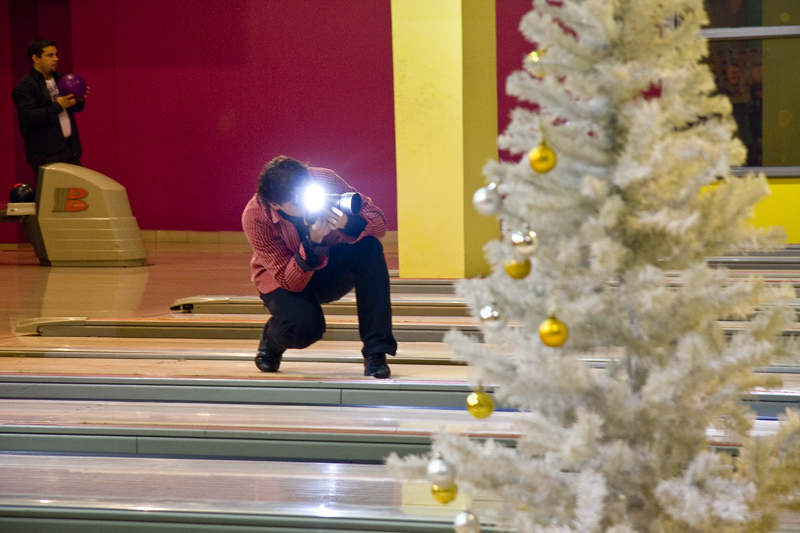 любопытны были первые минуты после утряски организационных вопросов. вышла бравая девушка, она же сотрудница клуба. рассказала всем по какому, собственно, поводу собралась, громко и бодро кликнула "СТАРТ!"... а в ответ тишина. секунду, две, пять. а потом кто-то решительный сделал первый бросок... и понеслось! Шары полетели, кегли посыпались. дым коромыслом, официанты на крейсейрской скорости разносят живительную влагу. Всегда улыбающийся Михаленко появляется то тут, то там. Неизменно с протоколом (?) в руках и вопросом: "Ну как, все в порядке?". а Пилипович в перерывах между бросками то шапки раздает, то советы. грохот работающих механизмов до неприличного легко перекрывается воплями болельщиков и ликующих игроков. страйков все больше. украдкой, чтобы не заметили, участники поглядывают на экраны соперников.