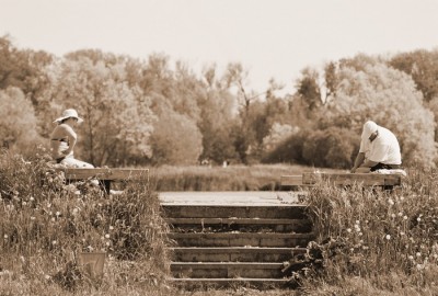 Посмотрев усыпальницу мы вернулись в усадьбу, расположились там на озере и приступили к трапезе. Озеро достаточно маленькое и заросшее, но там плавали лебеди и местные пацаны.